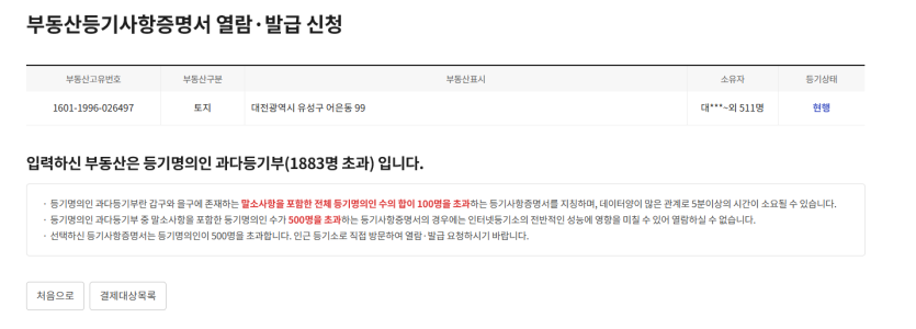 등기명의인이 1883명 초과인 토지등기부등본 발급 가능할까요? 이메일로 수령 가능한지 문의드립니다. ---------------- 답변 ----------------과다등기부는 온라인 조회가 되지않습니다. 인근 등기소로 방문하셔서 발급받으셔야합니다.